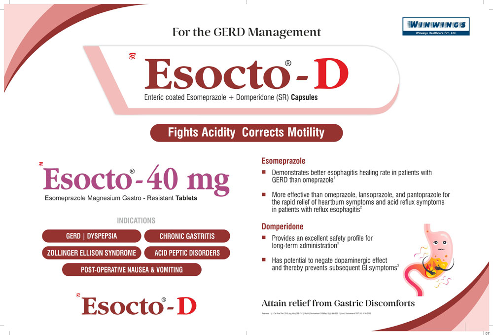 | Esocto - D | Enteric coated Esomeprazole + Domperidone (SR) Capsules |