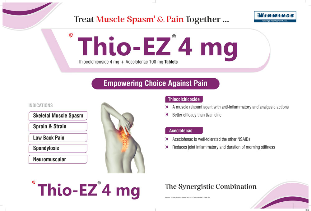 | Thio-EZ | Thiocolchicoside 4 mg + Aceclofenac 100 mg Tablets |